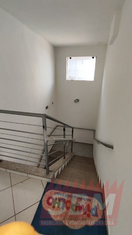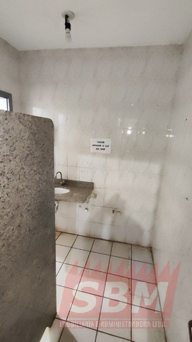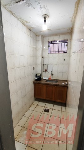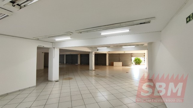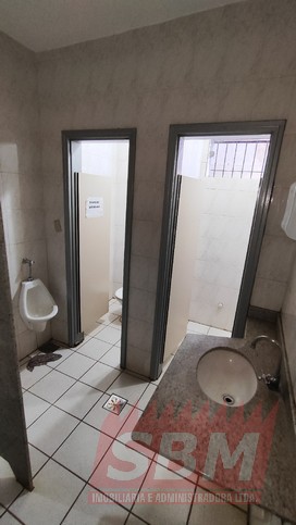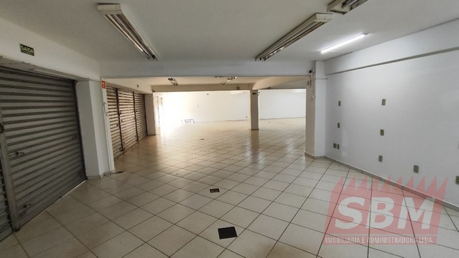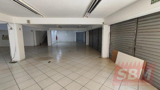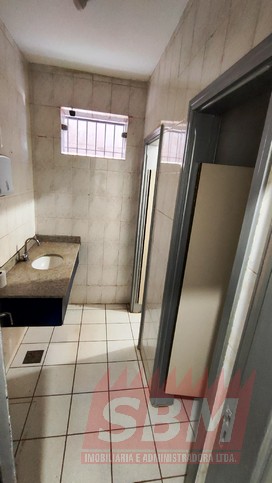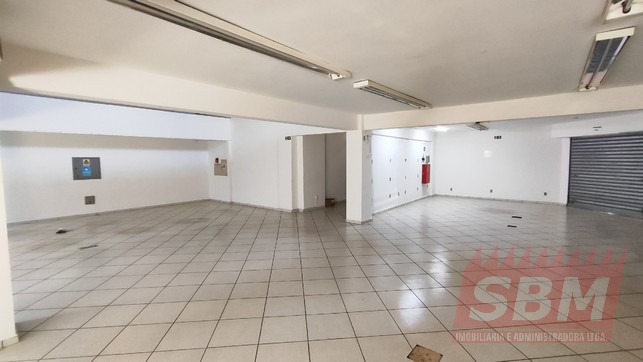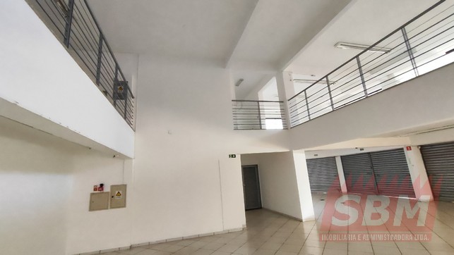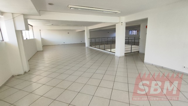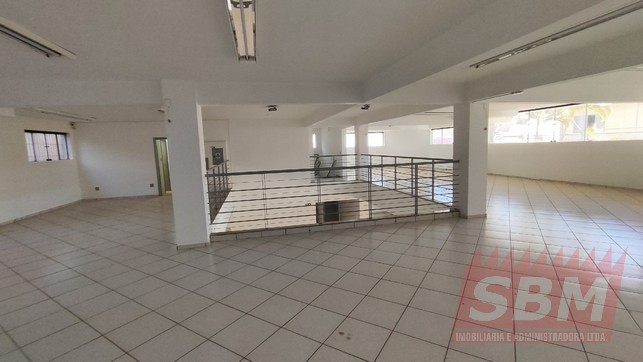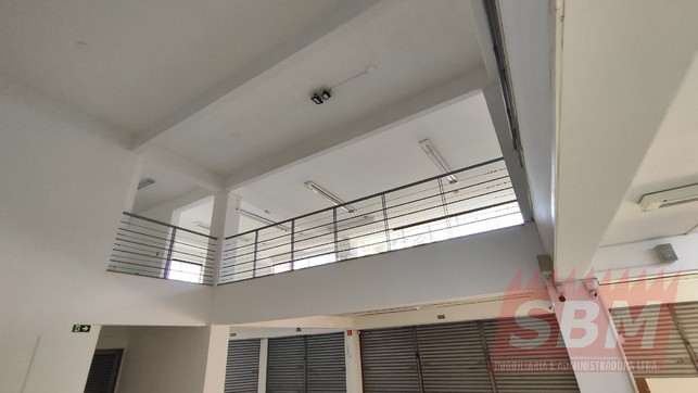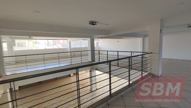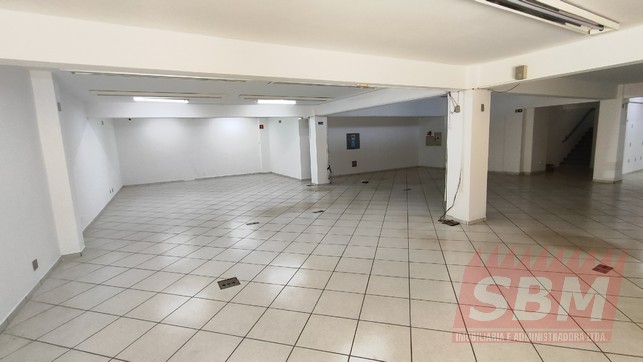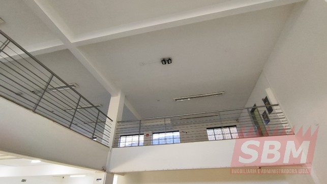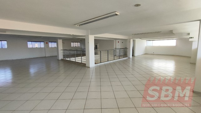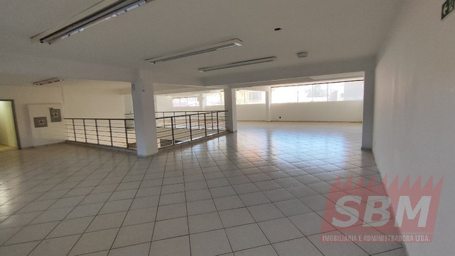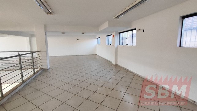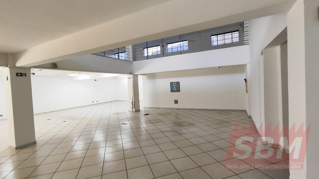 Salão amplo com mezanino, copa, banheiro masculino coletivo, banheiro feminino coletivo e porão.