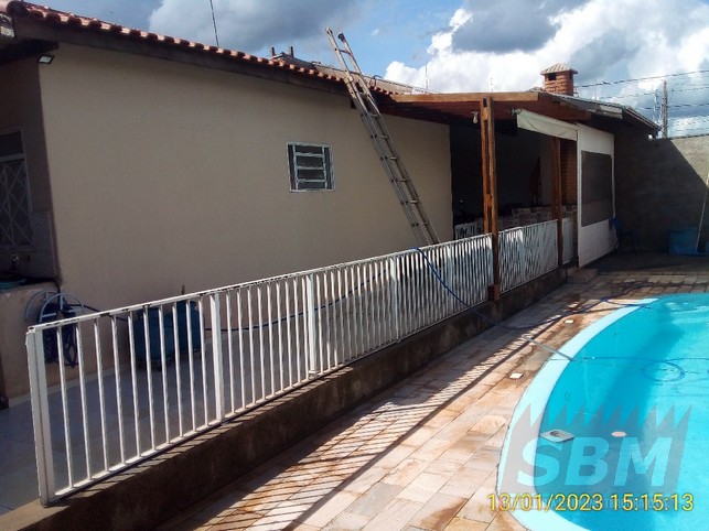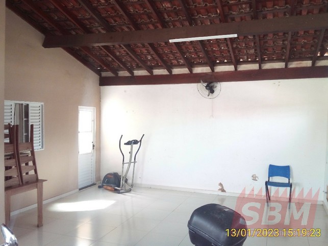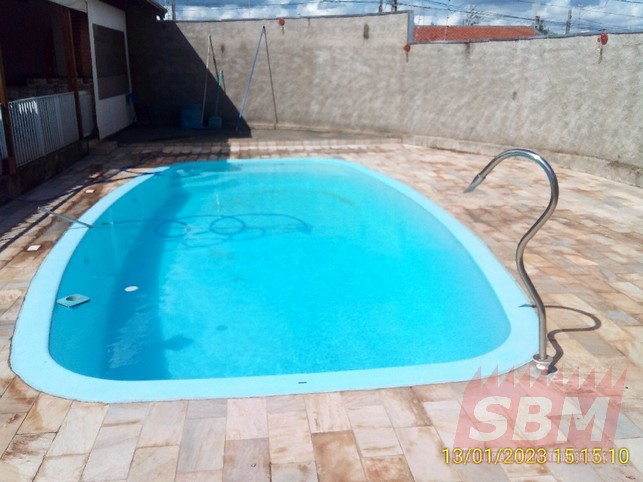 Casa com 02 quartos, sala, cozinha azulejada, banheiro azulejado, área de serviços e garagem coberta + pisicina + salão comercial com banheiro.