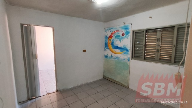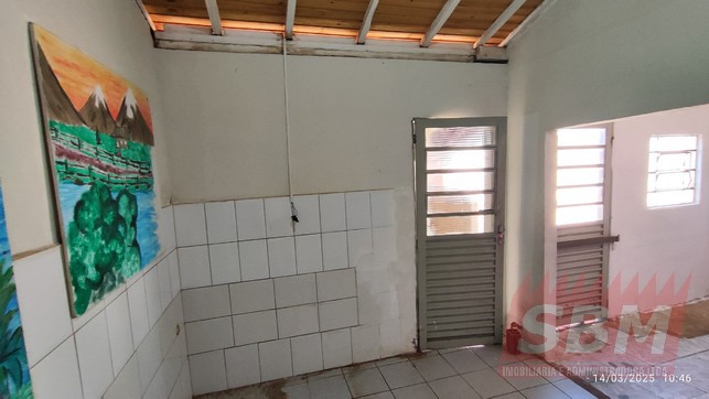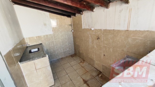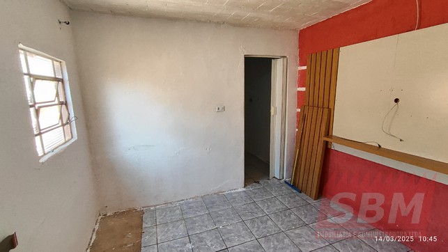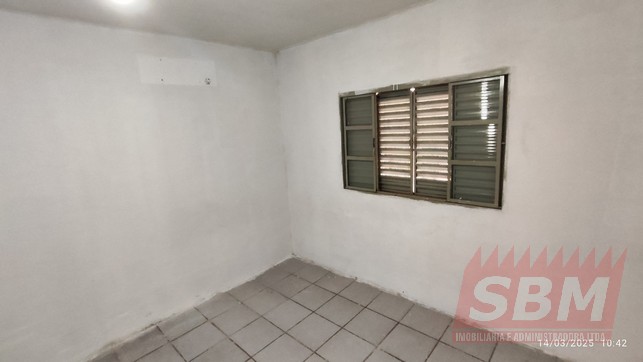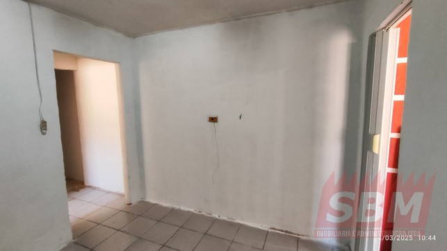 Casa com quarto, sala, cozinha, banheiro azulejado, área de serviços coberta e garagem descoberta.