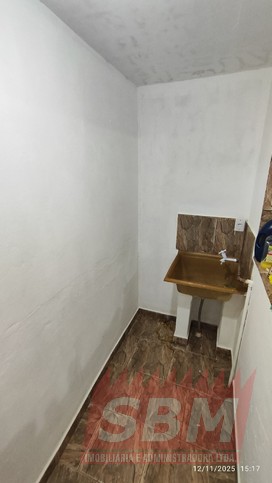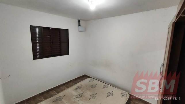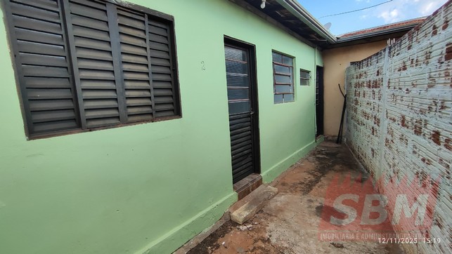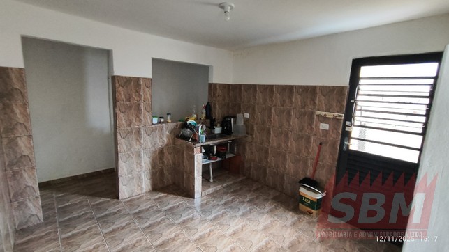 Casa com quarto, sala, cozinha azulejada, banheiro azulejado e área de serviços coberta.